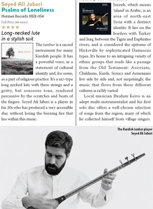 موسیقی ما - یک آلبوم موسیقی ایرانی در بخش مرور آلبومهای نشریه معروف سانگ لاین معرفی و چهار ستاره از پنج ستاره را به خود اختصاص داد.آلبوم «از زبور تنهایی»به آهنگسازی علی جابری، نوازنده شناخته شده تنبور و تار از منطقه کرمانشاه که اخیرا از سوی نشر موسیقی هرمس به بازار موسیقی عرضه شده بود، در بخش مرور نشریه سان لاین که شاخصترین نشریه مربوط به موسیقی ملل(world music) به شمار میرود توانست چهار ستاره از پنج ستاره ممکن را به خود اختصاص دهد.