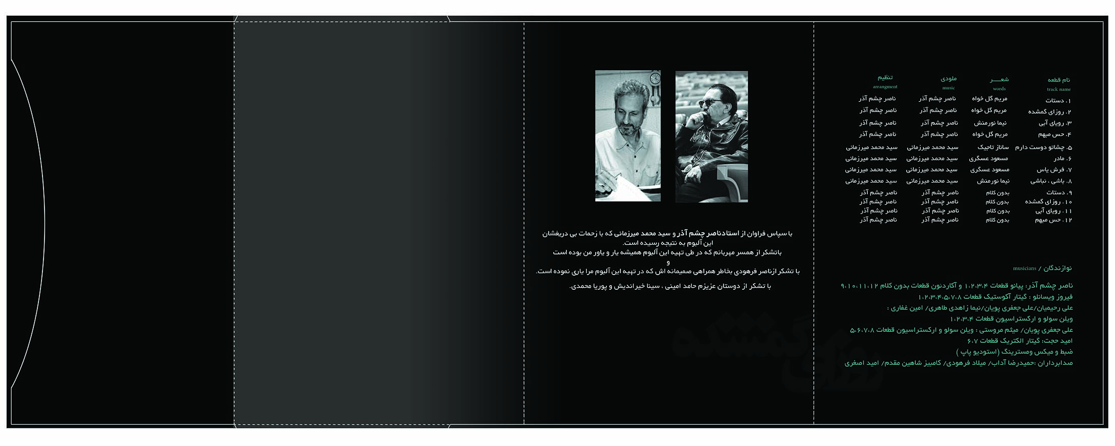 این هنرمند در انتهای صحبت های خود نیز گفت: «در این آلبوم نوازندگان بنامی همچون فیروز ویسانلو، علی رحیمیان، علی جعفری پویان، میثم مروستی، امید حجت، نیما زاهدی و امین غفاری نیز حضور داشتند و این آلبوم در استودیو پاپ ضبط و میکس و مستر شده است» این آلبوم شامل دوازده قطعه است که چهار قطعه از این آلبوم بی کلام است که آهنگسازی این چهار قطعه را ناصر چشم آذر بر عهده داشته است.